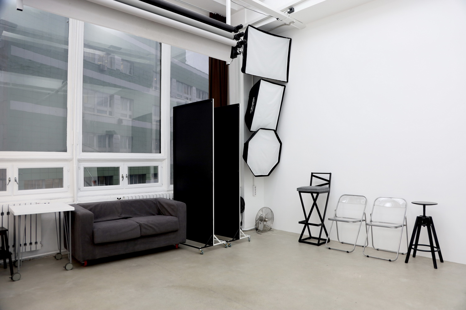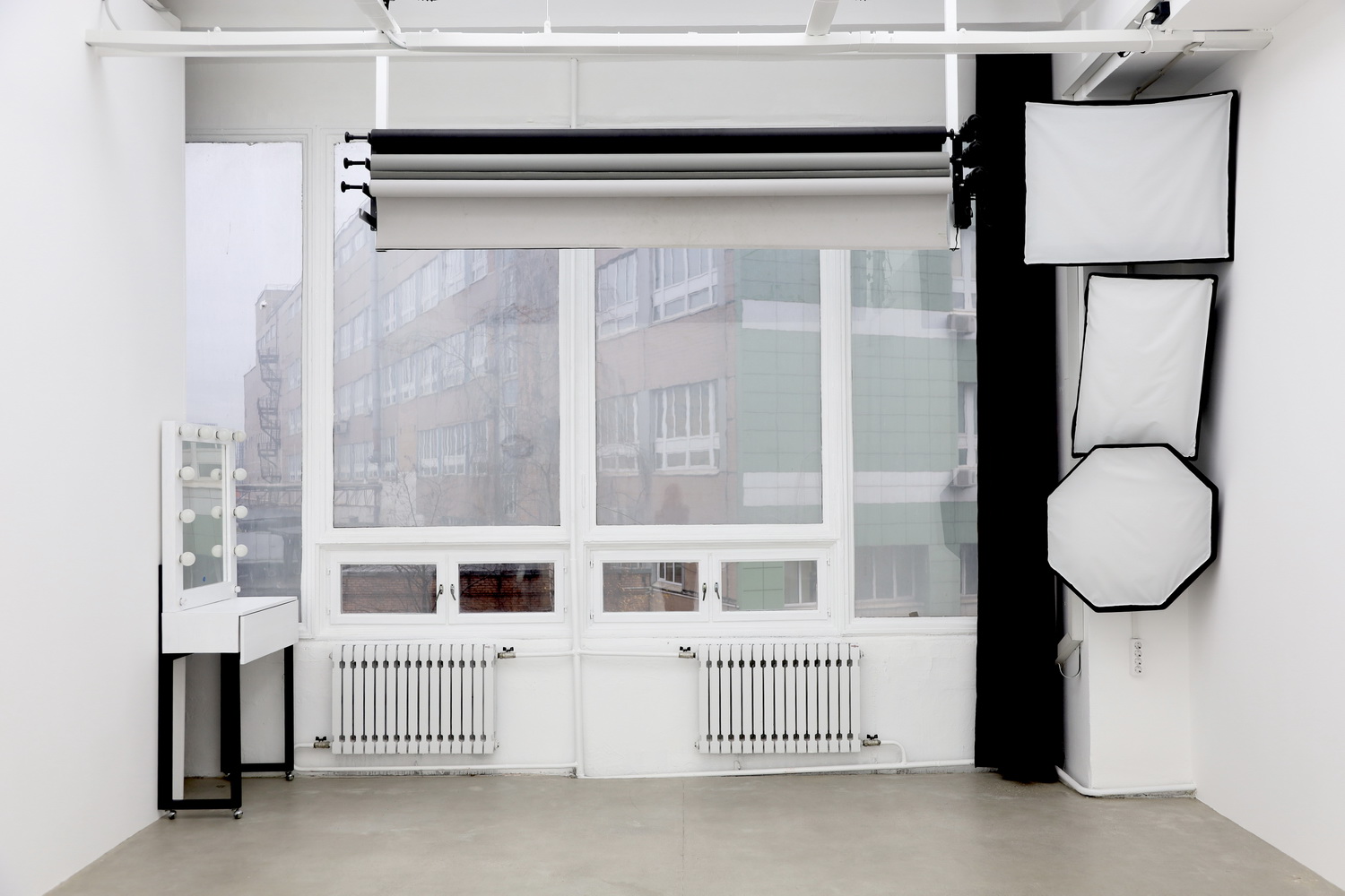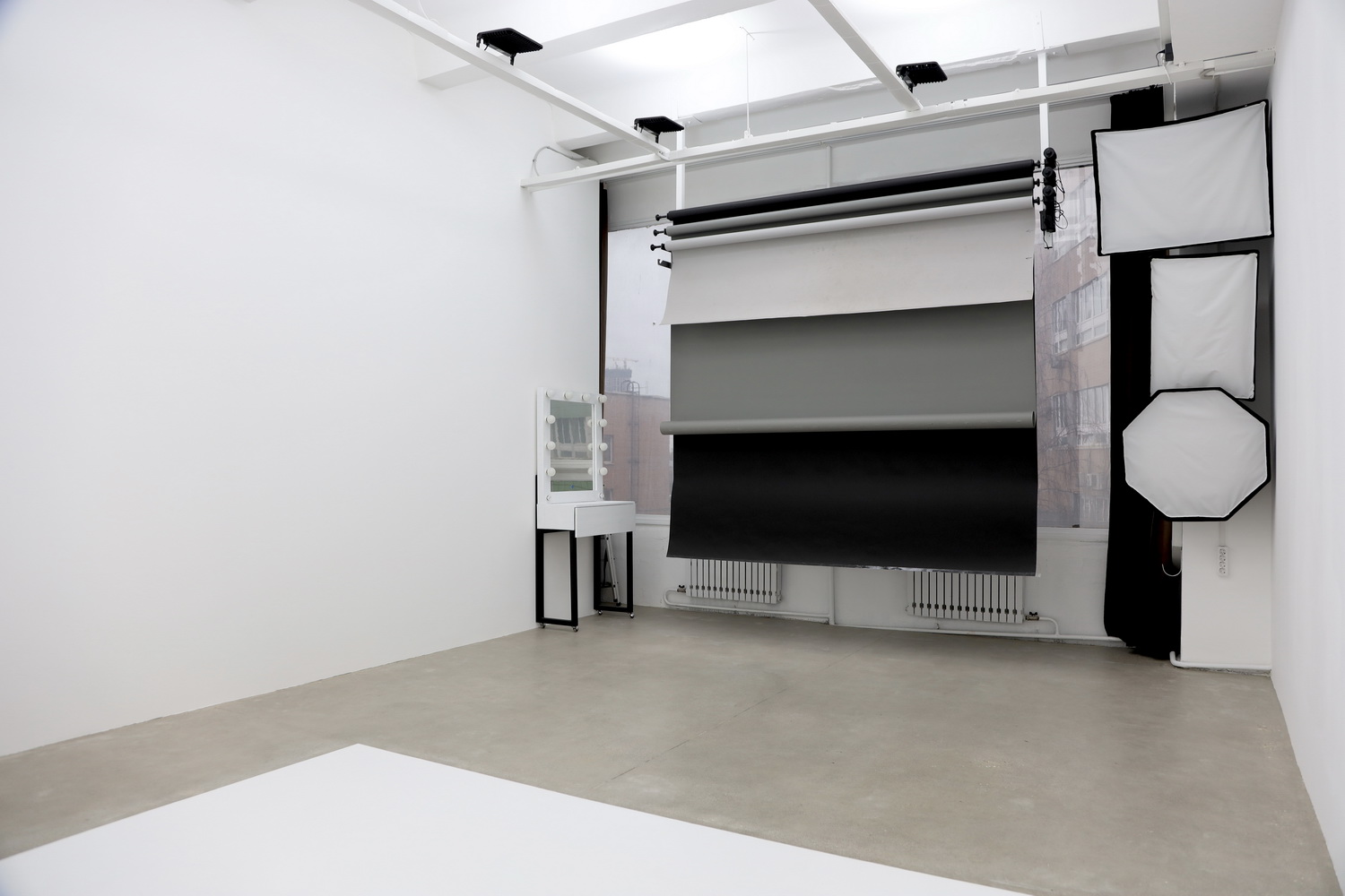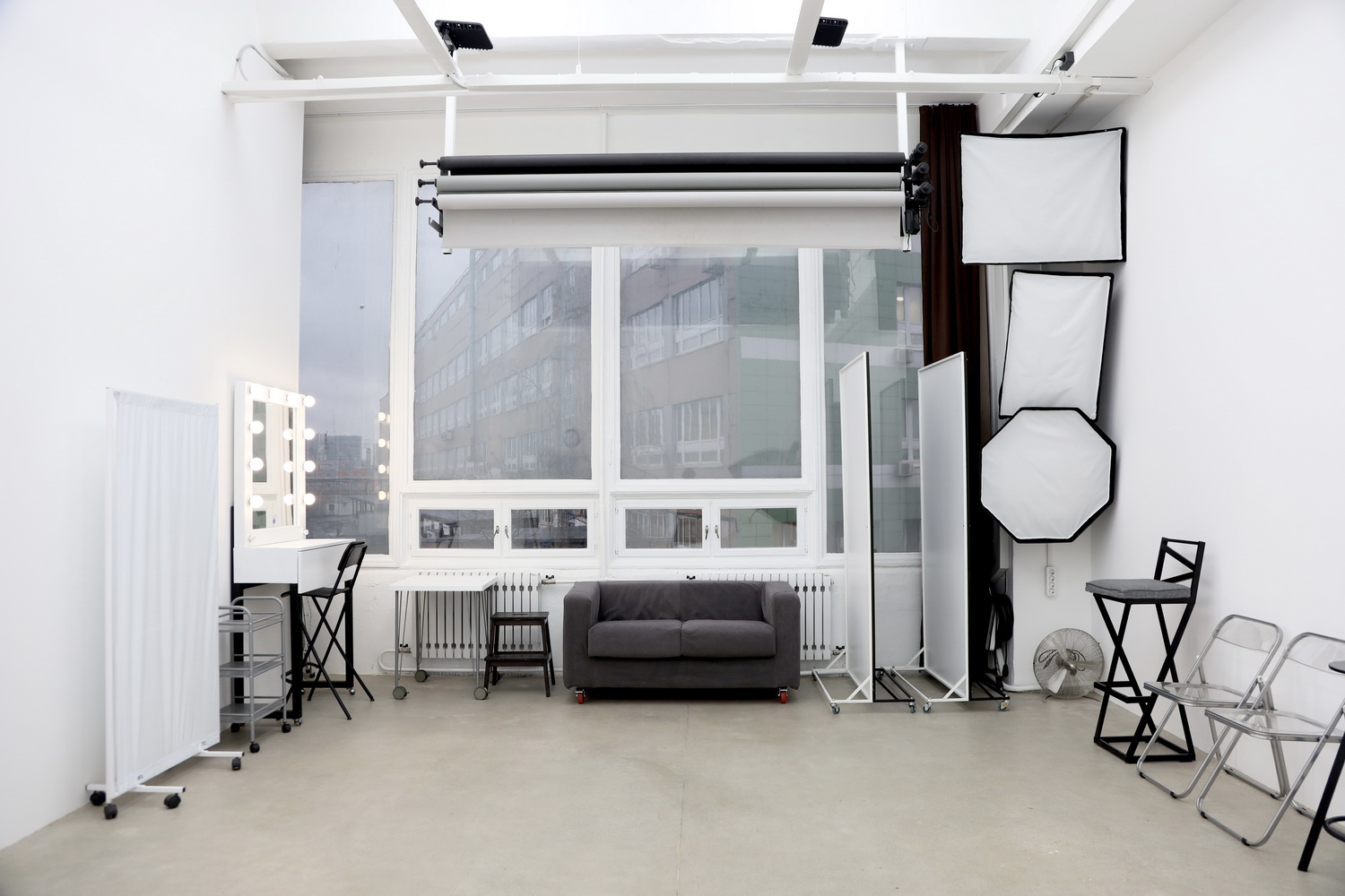 - Зал выполнен в минималистичном стиле. Циклорама + мебель + бумажные фоны.