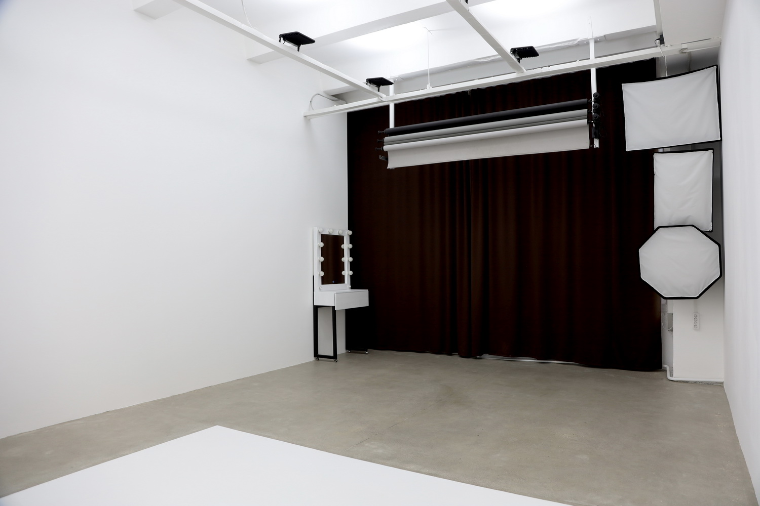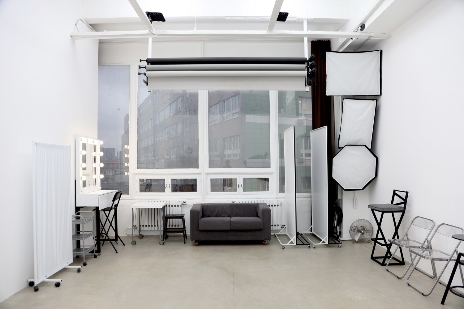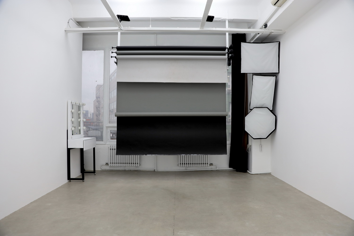 - Зал выполнен в минималистичном стиле. Циклорама + мебель + бумажные фоны.