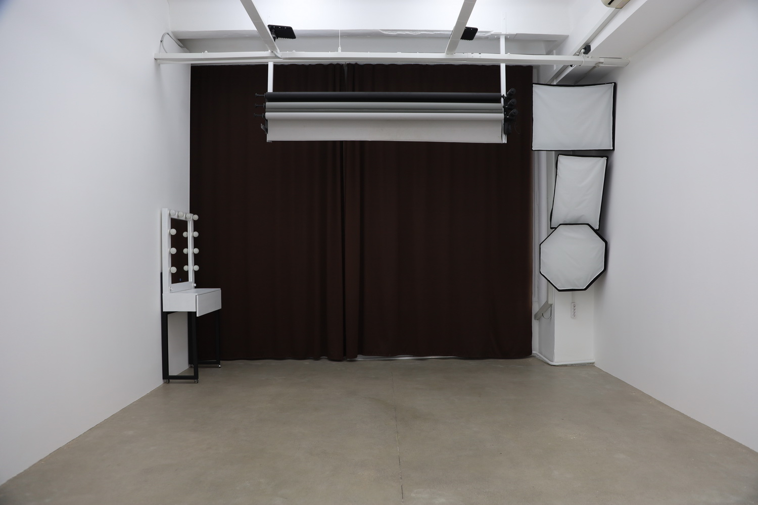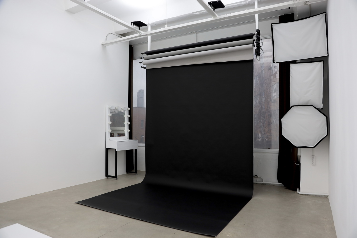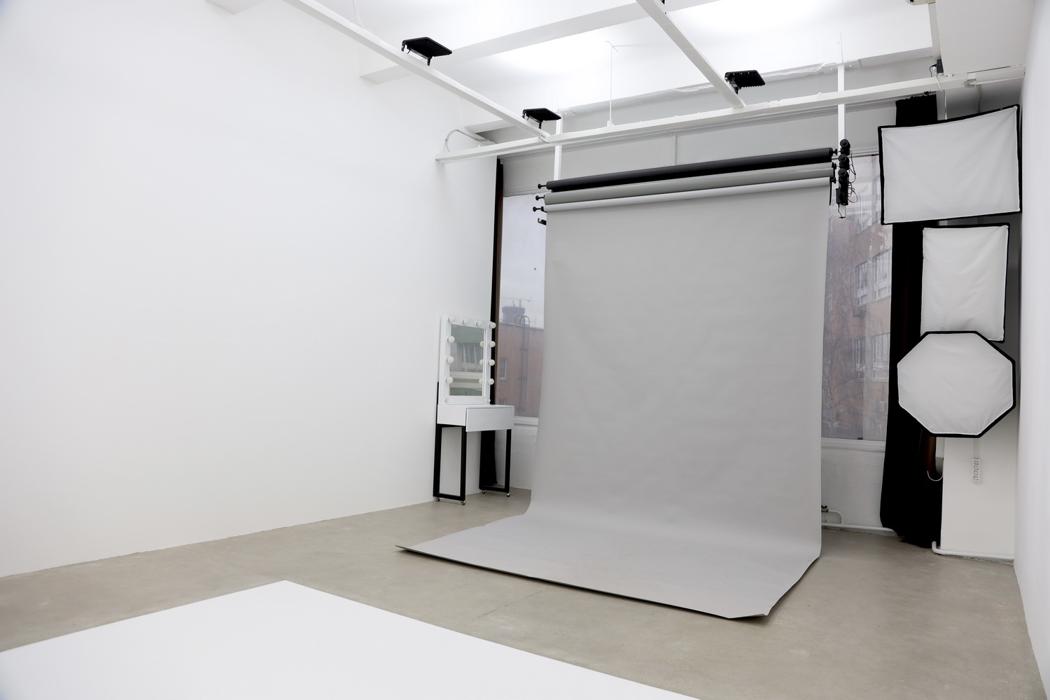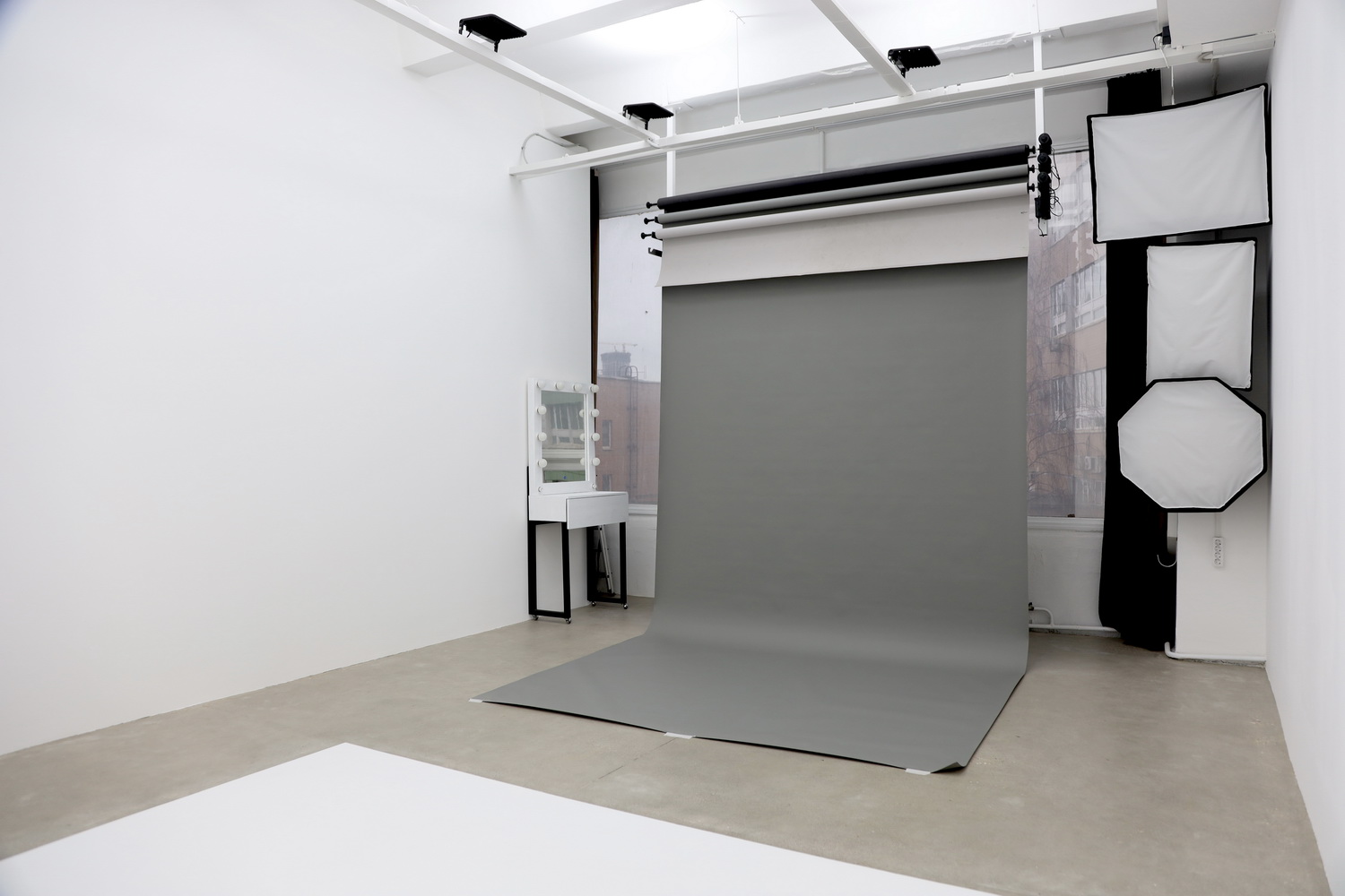 - Зал выполнен в минималистичном стиле. Циклорама + мебель + бумажные фоны.
