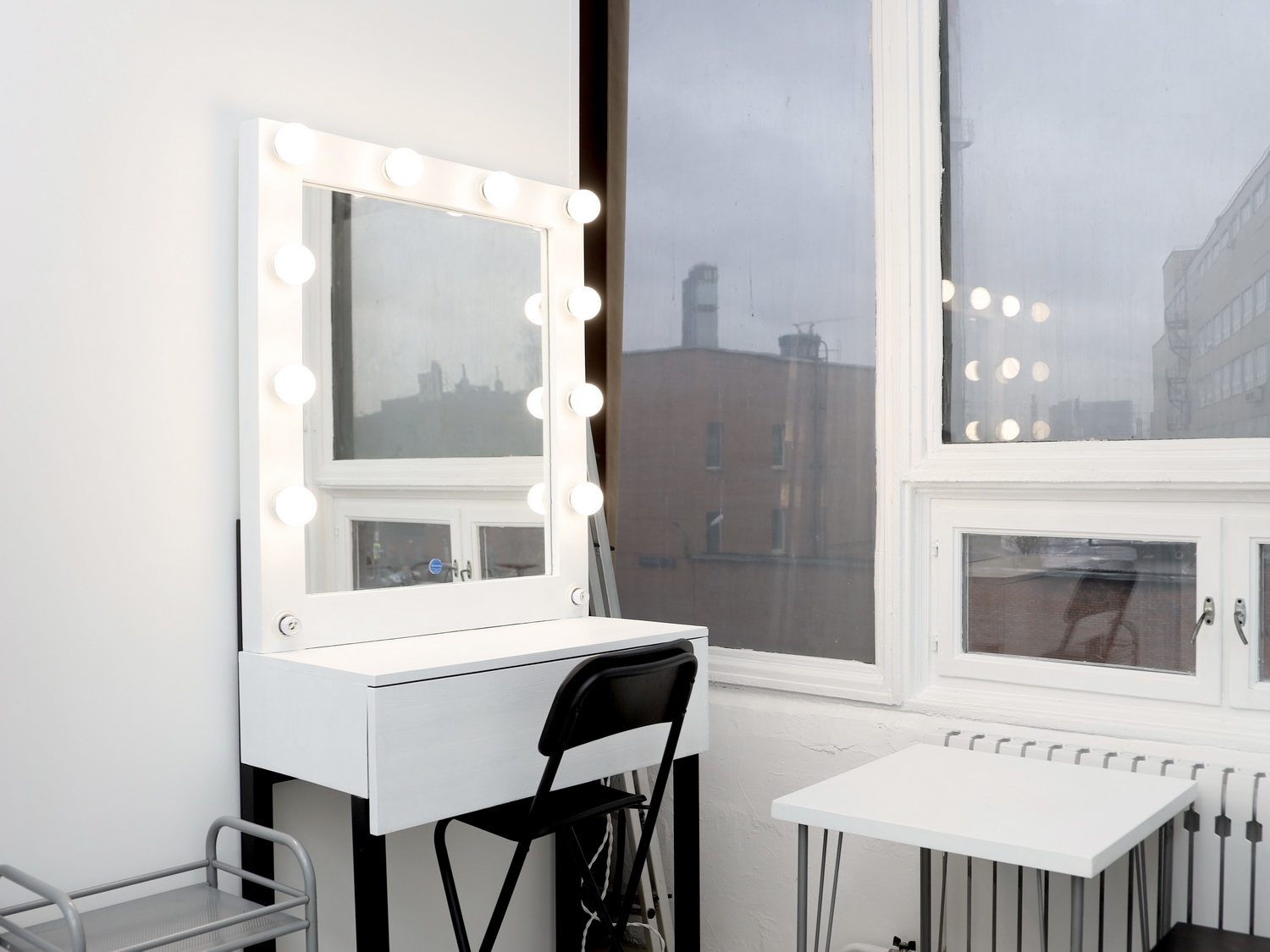 - Гримёрное место (стол визажиста с большим зеркалом и освещением по периметру, высокий стул для макияжа, розетки, многоуровневая металлическая тележка на колёсиках и мусорное ведро).
